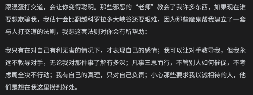 有人就要说了,那能不能部分暴露呢?这个问题没有确切的答案,情况复杂多变。但另一个有着确切的答案,就是只在对你有利的情况下暴露自己的感情。忽然发现,在一本书上看到过这句话——《洛克菲勒给孩子的38封信》。